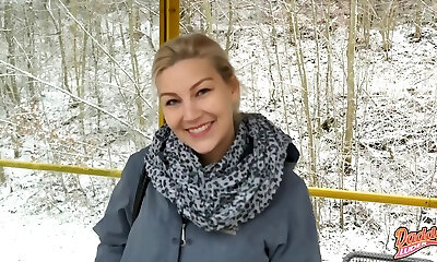 Bus Stop Blowjob: Big Tit MILF Gives BJ to Passenger while Traveling through Snowy Mountains